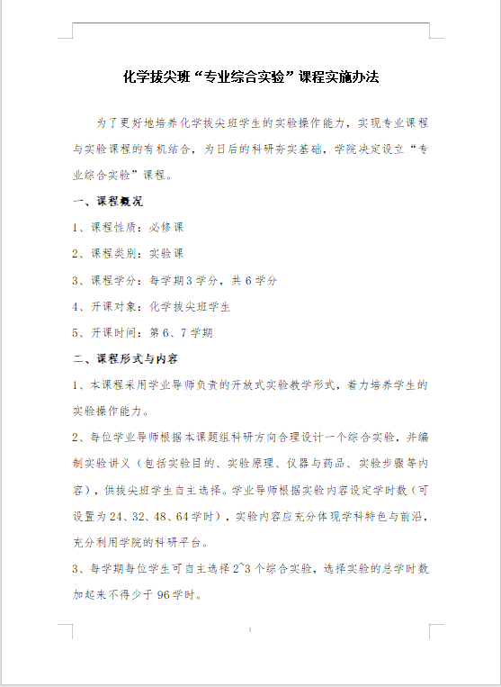 关于印发《化学拔尖班“专业综合实验”课程实施办法》的通知