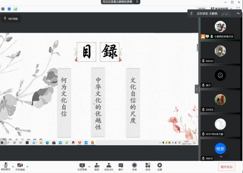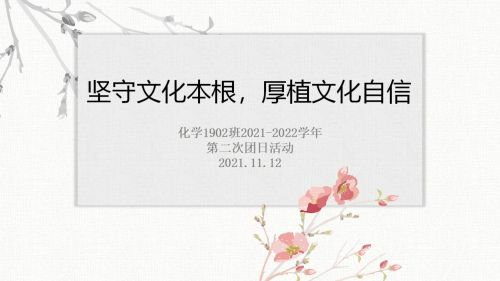 文化是一个国家、一个民族的灵魂。文化兴则国运兴,文化强则民族强。文化自信是一个国家、一个民族以及一个政党对自身文化价值的充分肯定和躬身践行,是中华民族独特的巨大优势。因此,为充分了解我国文化,坚守文化本根,厚植文化自信,化学1902班于2021年11月2日晚8点开展了线上主题团日活动,本次活动由团支书王鹏棋主持。