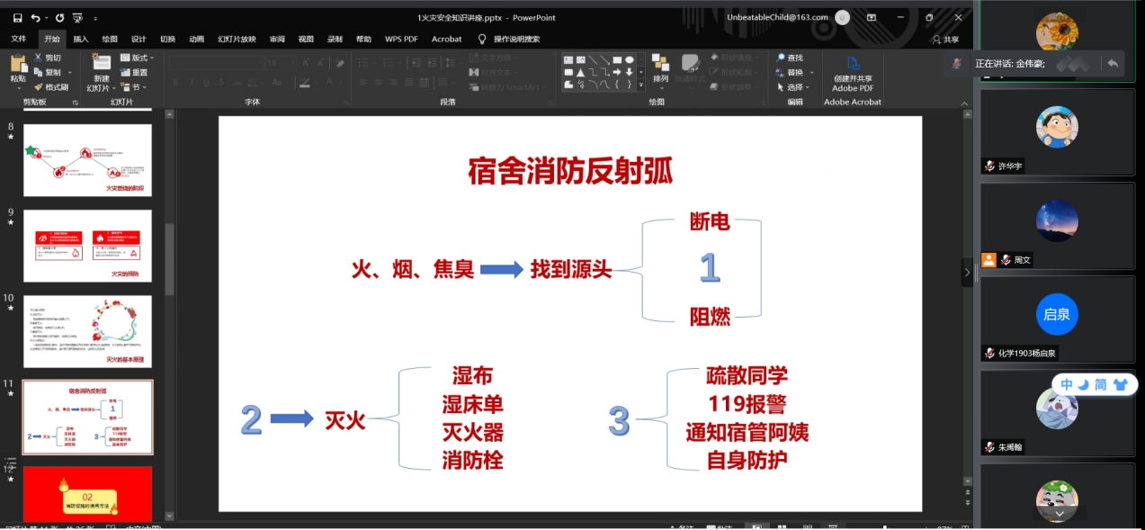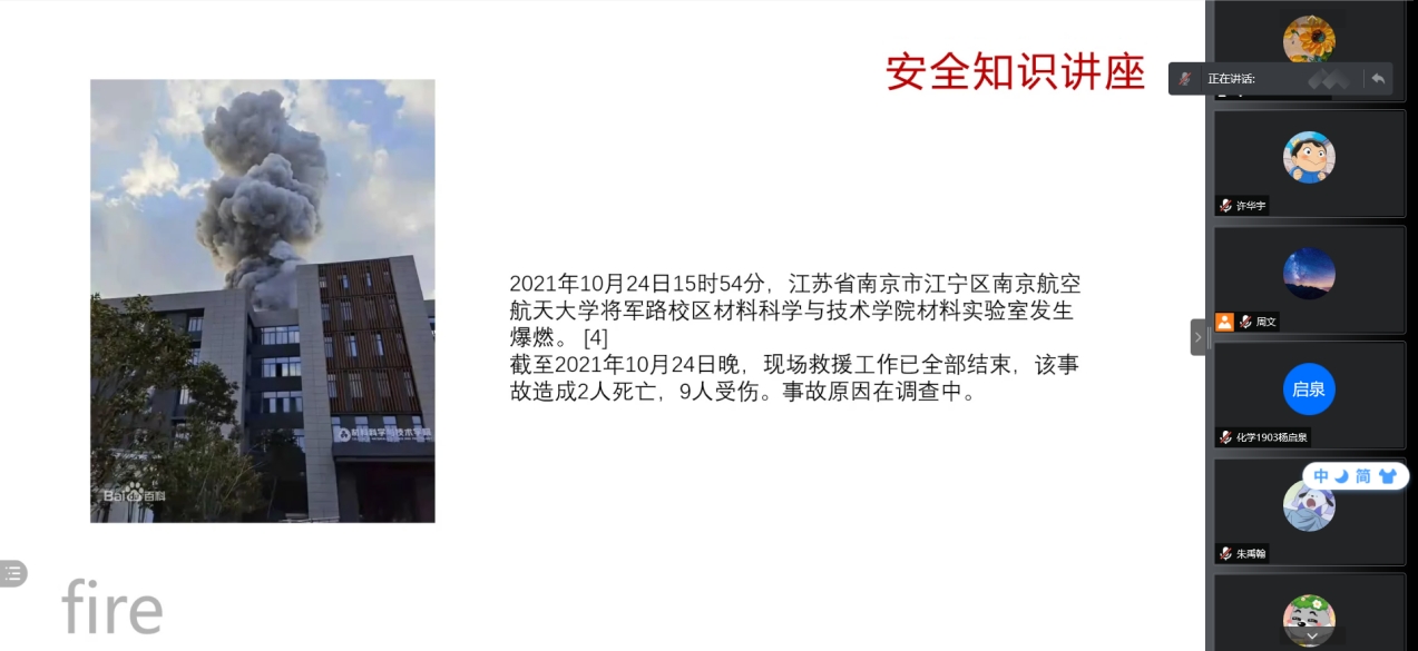 会议伊始,主持人金伟豪通过PPT的讲解向同学们介绍了易引发火灾的危险物品、火灾的类型、灭火方法及基本器具的使用。在这个过程中他多次向同学们强调要防范于未然、在生活中随时保持警惕,同时要注意多实践,掌握基本的灭火与逃生本领。而后,主持人结合本班专业,列举了几例实验室发生的消防事故。例如,2021年10月24日,江宁区将军大道29号南京航空航天大学将军路校区一实验室发生爆燃,共造成2人死亡,9人受伤;2018年12月26日北京交通大学市政环境工程系学生在学校东校区2号楼环境工程实验室,进行垃圾渗滤液污水处理科研实验期间,实验现场发生爆炸,事故造成3名参与实验的学生死亡。消防事故的发生带走的不仅是财力和物力,还有科研人员宝贵的生命,这告诫同学们在科研过程中也要随时注意消防安全。在PPT讲解完毕后,主持人播放了一段演讲视频,视频讲解了在火灾发生时正确的逃生方法,以及正确逃生的重要性,纠正了同学们以往固化在思想中的错误逃生知识。
