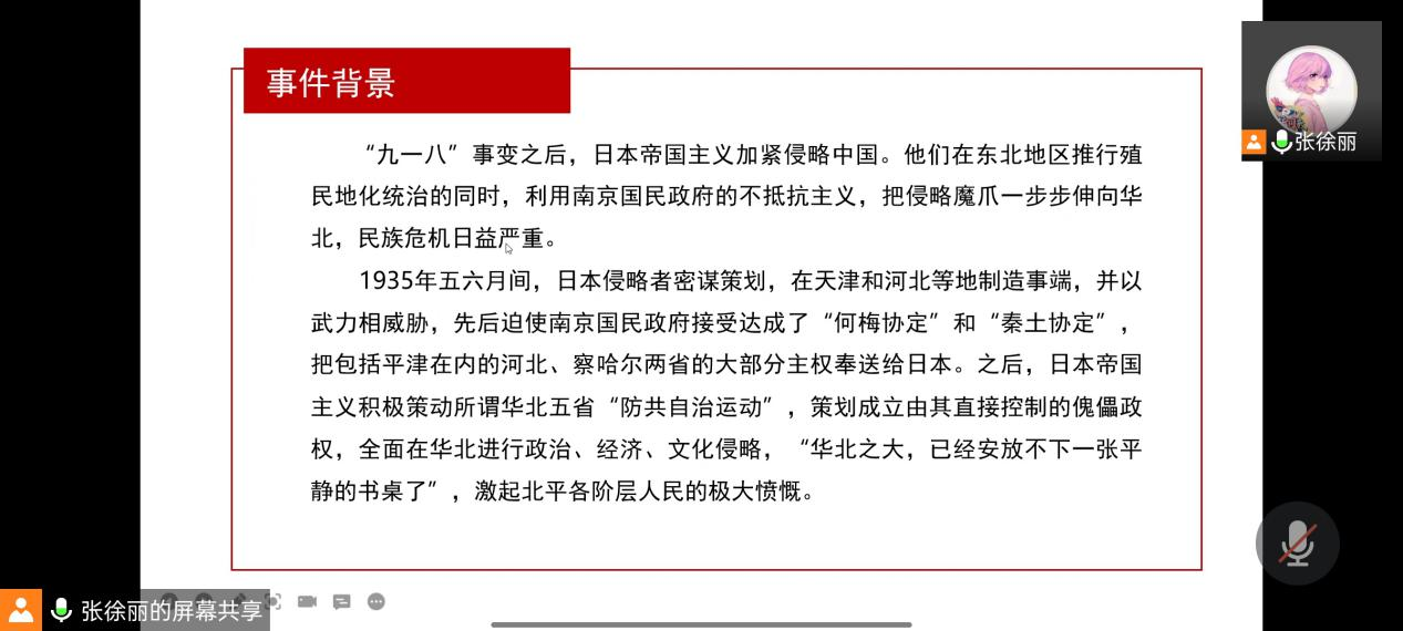 本次主题团日活动总共分为观看“一二·九”运动相关学习视频、结合PPT学习“一二·九”运动会的历史及其意义两个部分。