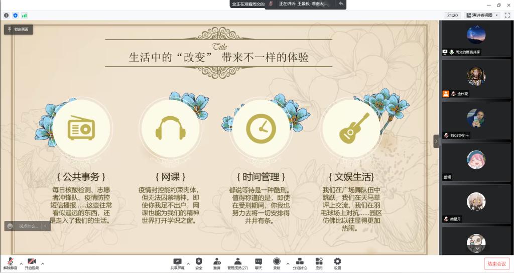 会议首先,团支书介绍了班会主题和会人员,并谈到本次园区隔离期间进行的网课与2020年在家隔离时的线上教学活动给了人们不一样的体验。在随后的交流讨论环节中,王景毅与肖镒林同学对网课亲身体验和隔离期间的难忘事件发表了自己的看法。王景毅同学谈到,在学校上网课同学们能从食堂很方便地获取午餐,十分感谢后勤保障工作为同学们解决了后顾之忧。肖镒林同学则表示网课比线下教学更加便捷,即使足不出户也能学到不少知识。