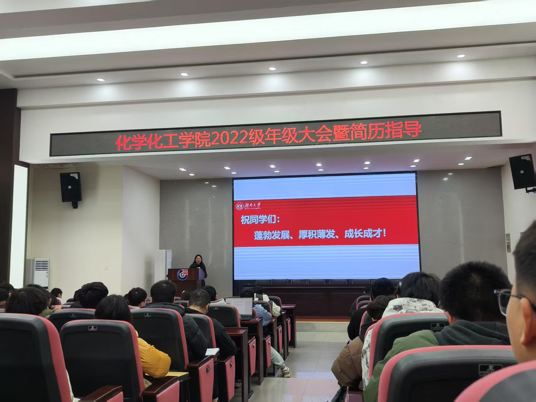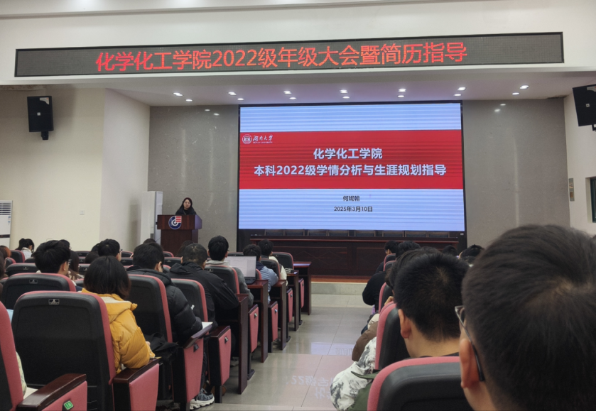 在新化工楼D区报告厅成功举办2022级学情分析与生涯规划指导大会,为同学们在保研、考研、出国及就业等方面提供了全面且深入的指导,吸引了众多同学积极参与。