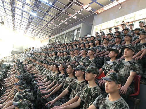 的全体新生与班助理就在天马二区篮球场集合完毕,在班助理的帮助下,新生们迅速将军装调整齐整,排好队列向主校区出发。