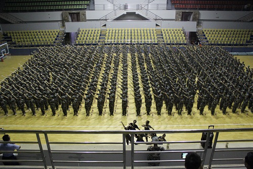 18级新生们在结束一天的训练后,于晚8点在操场集合,准备参加歌咏比赛的彩排活动。