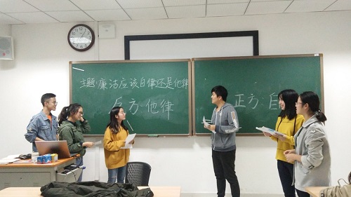 第二部分是同学们的辩论环节,开展主题为“廉洁应该靠自律还是他律”的辩论赛,正方的观点是自律,反方的观点是他律,双方分别以自己的论展开的激烈的论述正方认为廉洁靠的是自律,因为自律是一个人原则的根本,自律还可以提高自身的文化修养,养成良好的作风习惯反方认为一个做事的衡量标准,做任何事情的时候,应该根据这个标准来做辩论之后,同学们懂得了自律和他律的重要性,生活中人遵守一定的规则,同时还要有高度的自律性。