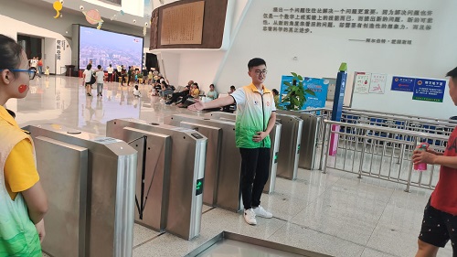 由于十一小长假,到科技馆进行参观的游客远超日常,小朋友人数偏多,秩序管理的难度较大,且在志愿者工作时间之外,科技馆依旧对外开放,所以很多同学并未休息,而是继续工作。在志愿者们的辛勤工作之下,游客们入场有条有序,场内秩序良好,这为游客展现了湖大学子的良好风貌。