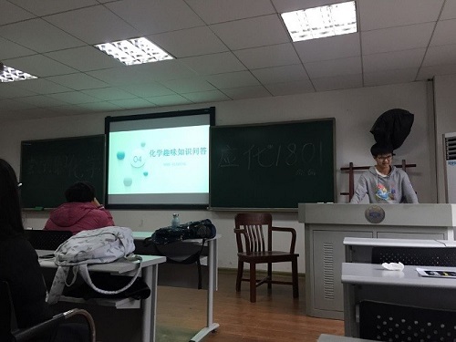 11月26日下午两点半,应化1801于综合楼409教室召开了化学文化节主题班会,此次班会由班长吴海量主持。班会一开始,吴海量同学就向同学们展示了本次化学文化节中记录精彩活动的一些照片,同学们十分感兴趣。随后,他给同学们播放了一些有关化学或者化学实验的有趣的视频,根据歌曲《爱我中华》改编成的《高锰酸钾》更是逗得同学们开怀大笑。看完视频后,接着是游戏环节。在班长吴海量给出了许多和化学现象有关的谜语,同学们纷纷举手回答。其中虽然有不少同学猜错了答案,但最后所有的谜底都被猜出。最后,班长和团支书给回答正确的同学们发放零食作为小奖品,班会就这样在和谐欢乐的气氛中结束了。