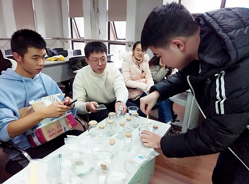 出现在科幻小说的神秘气球,其实起源于17世纪欧洲的天气预报仪器“Storm Glass”,在密封的玻璃瓶注入蒸馏水、酒精、硝酸钾、樟脑等混合液,这种液体会随着天气改变面貌的气象仪,曾经普遍运用在19世纪的航海上而今天的第一项活动内容就是进行天气瓶的制作。活动伊始,由团支书闵凡同学对天气瓶的原理进行讲解,他还动手向大家演示了一遍天气瓶的制作方法,随后,同学们领取了材料,投入到了制作天气瓶的“战斗”之中。大家还根据个人喜好,在天气瓶中加入了不同的颜色,制作出了形形色色的天气瓶,让人眼前一亮。仅管也有些同学失败了,但大家都很享受在一起的这段时光。