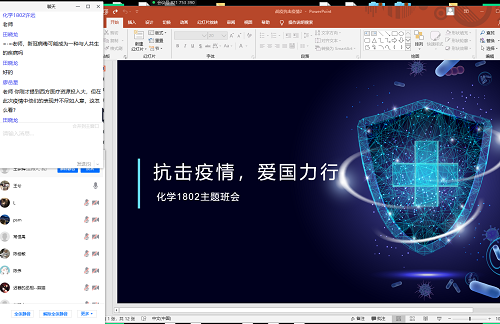 3月17日晚七点,化学1802班全体同学通过腾讯会议举办了以“抗击疫情,爱国力行”为主题的班会,班会由班长王梦辉主持,班导师王兮受邀参加。