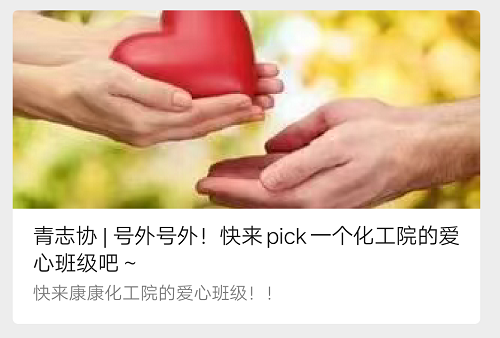 3月14日,化工院青志协在院公众号发布爱心班级评比通知,阐明了“携手抗击疫情,争创爱心班级”活动将在全院范围内开展爱心班级的评定,经过线上投票和评定加分环节评选出“抗击疫情,爱心班级”和“爱心班级”荣誉班级,并在院内进行公示和表彰。