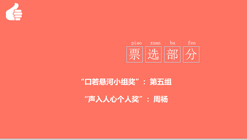 在各组发言完毕后,同学们对发言同学进行了投票选出了此次会议的最佳小组第五组和最佳发言人周杨。