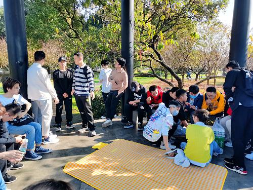 阳光明媚,天朗气清,学生在指定时间前到达地铁站口集合,由两班班长清点人数后共同带往目的地。在行进路上,学生都兴奋不已,脸上洋溢着对团建活动的向往和对眼前动人景色的惊叹。