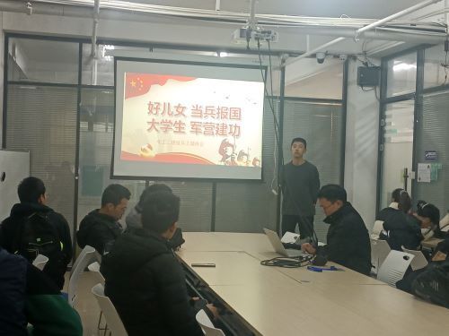 活动伊始,班长于浩洋同学首先就应征入伍政策向同学们进行了简单介绍,随后于浩洋同学用PPT的形式展示了政策与要求的细节,向大家深入阐述参军入伍的意义,鼓励同学们积极参军入伍,通过PPT结合相关视频介绍,同学们对参军入伍的意义有了更深入的了解。了解了政策要求内容后,班长于浩洋同学播放了一段有关中国军人及大学生参军体会的视频,从更深意义上来说,参军入伍已然不是一件事或行为,它更是一种精神,一个向标,它所蕴含着的精神可以说贯穿中国发展史,直至现在依然有着不可替代的作用和意义。视频结尾,鲜艳夺目的五星红旗在空中飘扬,嘹亮的军号声声嘹亮,同学们观看后情绪都十分激昂。最后,于浩洋同学询问是否有想参军入伍的同学并分享了详细的资料,对此次班会做了简要的总结。