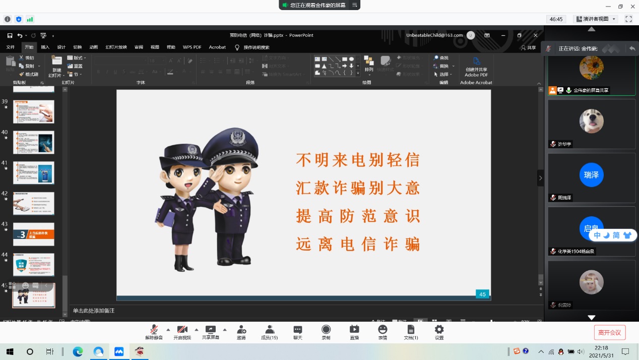 晚上2230分,班会圆满结束。本次班会提升了同学们的防诈骗意识,相信同学们能做到不大意、不轻信、不随意向陌生人转账,更好地保护自己的财产安全。珍爱生命,谨防诈骗,希望同学们永远不要落入骗子的圈套。