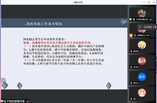 通过腾讯会议开展2021级学生助理第二次培训。本次培训主题为资助及评奖评优,主讲人为化工院2019级辅导员、资管中心资助兼干于哲老师。