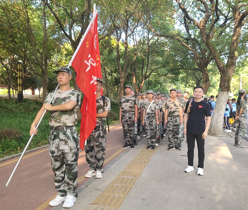 承担了本次拉练为全营带队并保管营旗的任务,在完成旗手的选拔后,跟随者鲜红的旗帜,新生们迎着一轮旭日正式出发了。全体新生在教官的组织下成三列纵队前进,沿着校内的道路走到湘江边,感受着朝阳的力量,向着目的地李自健美术馆进发。每个营之间首尾相接,沿途时常有不同排面及不同营之间的拉歌,为辛苦的拉练增添了许多欢乐。而在此过程中,有部分同学因身体原因渐渐跟不上队伍,但他们依然坚持着走完全程,学校也在沿途设置了多个医疗救护站点,保证能够及时为身体不适的新生提供帮助。最温暖的一幕是无论哪个学院的新生身体出现不适,其他院的学生助理及老师看到了都会上前关心慰问,及时提供力所能及的帮助,保证不让任何一个新生落单。化工院党委副书记潘刚峰老师也全程陪着大家一起拉练,和大家一起感受拉练的汗水与魅力。抵达目的地后返程的途中,同样的风景也有了不同的样子,连风的脚步都更轻快了。