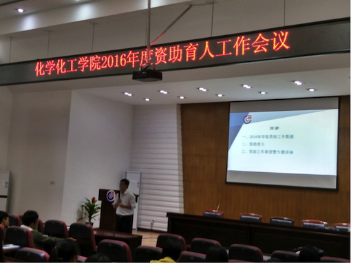 学工办主办的“资助育人,传递爱心”主题报告大会在化工院D区报告厅举行。本次大会由资助兼干刘世明老师主持并作了专题讲座,由资助助管丁攀飞同学再次发起“爱心互助基金”的倡议,化工院本科在库生、获奖获助学生代表以及部分研究生参加了此次大会。