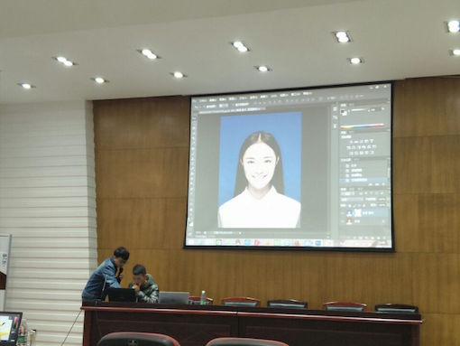 如果说表情包的制作是创意的激发,那么证件照的处理则更偏向于实际的使用。如今证件照在不少正规场合都会使用,于是对于证件照的处理便成了一个重要的课题。韦源松以一张证件照为例,就如何更换背景色、如何调整照片的色调以及如何美化照片进行了演示。学员们听得很认真,还不时做笔记。之后刘钰鹏学员主动要求上台体验,在韦源松的指导之下,他也完成了满意的作品。