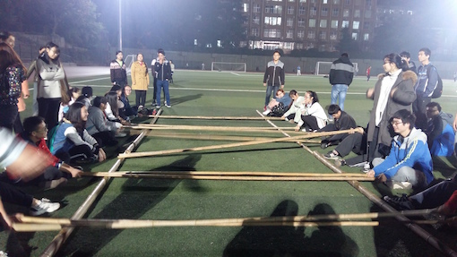 本次活动共组织了三项游戏,分别为跳竹竿、躲避球和跳皮筋项目。参加本次活动的六个班级分为三个小组,轮流体验三项游戏。跳竹竿是中国少数民族一种古老独特的活动,也是一项令人陶醉的文艺体育运动。它不但姿态优美,富于节奏,而且气氛非常欢快热烈,吸引众人。在学会了步伐节奏后,同学们踩着欢快的步点踏入了竹排阵。负责敲打竹竿的同学们配合默契,竹竿敲打的节奏铿锵有力,整齐热烈。同学们有的单人跳,有的则手拉手一起跟随节奏跳跃,也有的男同学没有赶上节拍被竹竿夹到了脚,惹得围观同学笑声不断。操场明亮的照明灯将同学们的影子拉得好长,同学们欢快地跳跃,影子也在地面上舞动,操场上生气勃勃,充满着大学生青春昂扬的气息。