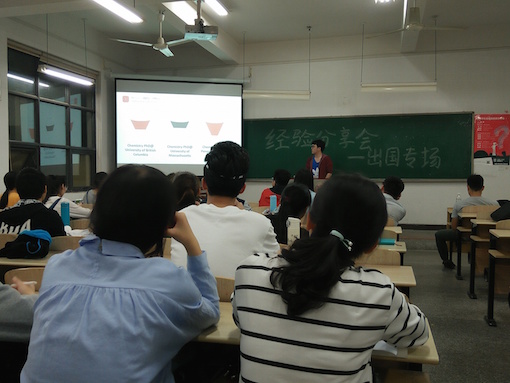 出国经验分享交流会在综合楼102圆满召开,本次交流会邀请到了化工院2013级获得国外知名大学office的肖烺秋、王佳璐、贾旭同学参与此次交流会。此次交流旨在通过优秀毕业生的经验谈,为已经笃定方向,但无从下手的大三学生指明找出国的途径和方式,提前做好准备。也同时为尚在迷茫状态的大二大一的学生们提供参考,让他们更好地思考今后的方向,找到适合自己的道路。
