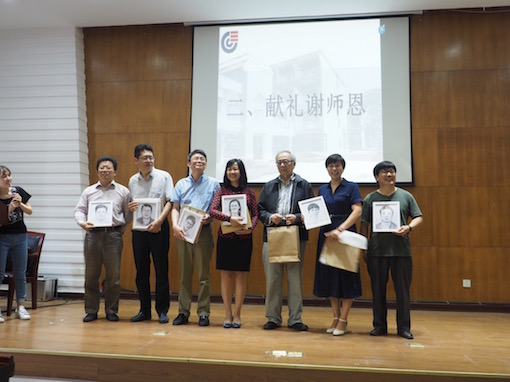 很快就进行到典礼的高潮部分:感谢师恩。领导们上台接受学生代表的献礼——手绘肖像。所有老师的画像都各具特色,无比生动。老师们都很喜欢也很珍惜这份饱含着同学们感激的小礼物,紧紧地抱在怀里,大家一起合影留念。之后,所有老师们上台接受全体同学的鞠躬礼,一声“老师,谢谢您!”不知饱含着多少的深情无法诉说。随后,学生代表王楚晴同学上台朗诵了感谢信,在信中,她深深地感谢了老师们:“是老师让我们感知到了学习的意义和知识的魅力”,并且表达了作为湖大化工人的自豪感以及一定会做一个“实事求是,敢为人先”的湖大人的决心。很多同学在座位上默默流下了热泪。
