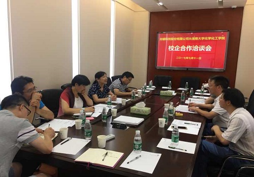 在院办公楼一舍123召开了校企合作洽谈会。出席此次会议的有龙蟠科技股份有限公司董事长石俊峰先生、人力资源总监文科先生、化工院党委书记王玉枝教授、院长蒋健晖教授、党委副书记陈义红老师、副院长崔坤在老师、实验中心主任郭栋才教授、教学办秘书蔡炽老师以及团委书记兼2017级辅导员曾芷兰老师。龙蟠科技有限股份公司与化工院双方就学生实习就业和企业如何助力学生人才培养两方面进行了深入的交流讨论。