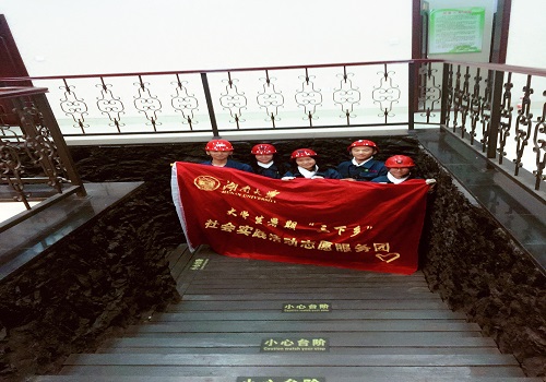 此次团队进行的是井下探秘游项目。在更换了专业的衣服和穿戴上专业的设备后,团队成员先是跟着讲解人员下了一个长度尽400米的楼梯斜坡。刚进入斜坡成员们就感受到了一阵强风,经讲解介绍,队员们得知这是为了保证井下的正常通风而在井下安置了一台超大功率鼓风机。然后映入队员眼帘的是各种井下需要使用的设备,与地上工作的设备不同的是,井下的所有设备都有了防爆的功能,且不时有检测瓦斯的仪器悬挂在地下通道的墙壁上。再往里走,是各种地质层的介绍,以及一些现象的具体展示如“断层”等。最后一部分展示的是从古至今的开采煤矿的方式,从一开始的一凿一凿地敲下一块块煤到如今的纯现代化机械量产,这也从侧面展示了中华民族的发展历程和中华儿女的智慧。从矿井上来后,成员的衣服早已被汗水浸透,厚重的橡胶靴也让成员们觉得脚底隐隐作痛。但矿工们不仅要花费同样的力气走到矿井下,还要连续工作八个小时,其中的艰辛可想而知。