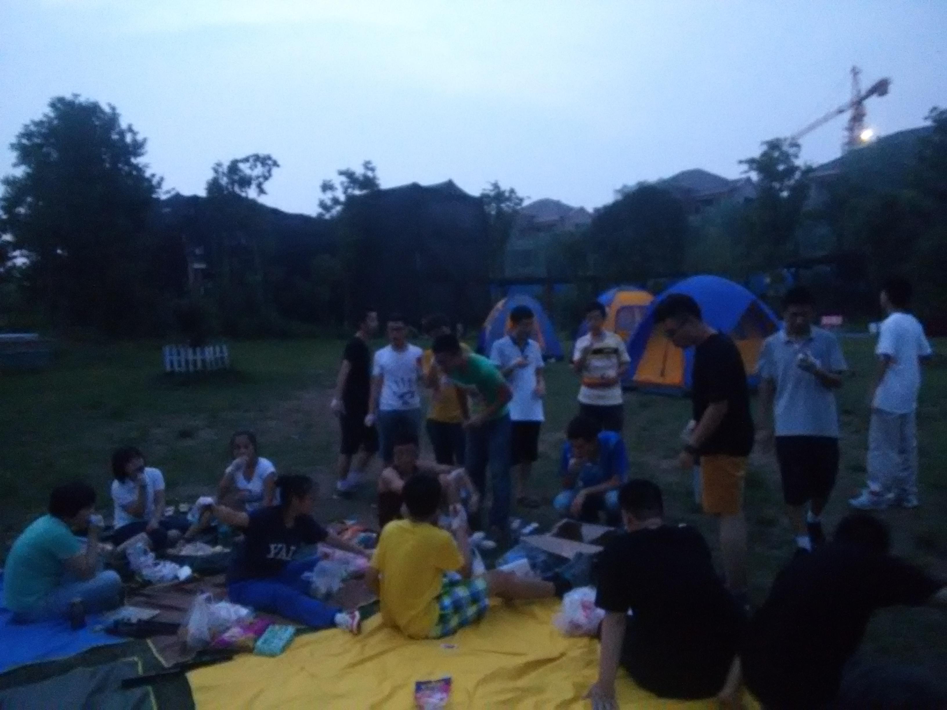 到达目的地后,我们顿时感觉到一股凉爽的清风迎面而来。望过去,满眼的绿色让我们心情愉悦。我们相互帮助,依次搭好了帐篷。然后我们将各自买的食物拿了出来,顿时露营地点成了吃货们展示自己胃口的地方,各种各样的食物都入了我们的肚子里。