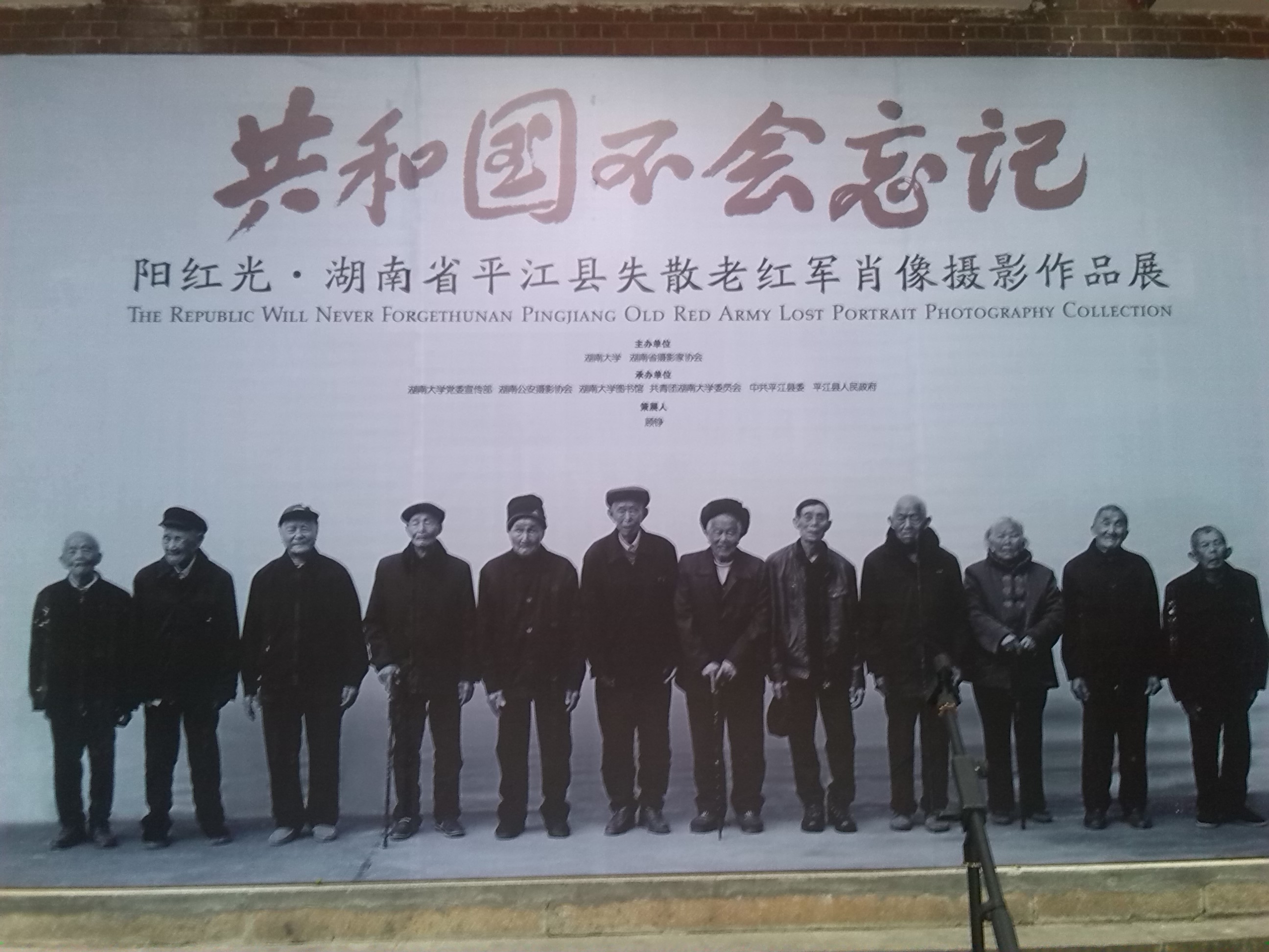 9点,开幕式正式开始。天空中飘起了雨丝,为这个特别的日子增加了一些秋衣。围观的人群自动站成一路路纵队。主持人宣布开幕式正式开始,并且介绍了到场的嘉宾。然后,我们见到了此次老红军摄像作品的作者——阳红光先生。阳红光先生也是湖南省平江县人,现任中国摄影家协会会员、中国公安摄影家协会理事兼副秘书长、湖南省摄影家协会顾问。阳先生于2012年6月开始创作《共和国不会忘记》系列摄影作品,历时一年多,作品先后在中国美术馆和湖南多地展出。阳红光先生说他的镜头无法穿透历史的纵深记录他们当年鲜血甚至生命的付出,自己唯一能做的只是聚焦是他们现在布满皱纹的脸、佝偻的背影和朴素的布衫。