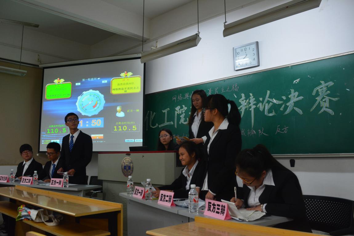 本场辩论赛以“网络舆论是不是民主之福”为辩题,在化工一班和化学三班,化学四班和化工一班之间展开,经过几轮激烈的唇枪舌战,化学三班,化工一班,化学四班分别获得冠亚季军。两场比赛都是精彩至极,双方辩手紧扣辩题,为评委观众展现了辩论的魅力所在。而在冠亚军争夺赛中,化学三班和化工一班更是以出色的口才诠释了冠亚军的真正实力。