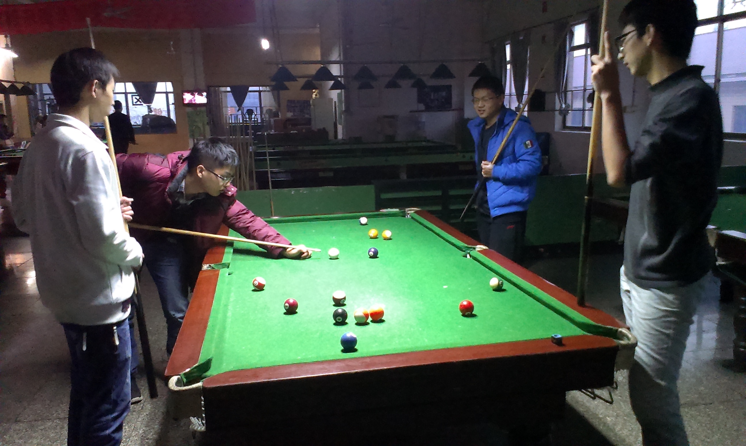 再将视角转向台球组,发现同学们也玩的开心!你看,他们聚集会神地瞄准路线,紧握球杆,再击球,一个个台球便进入了它们应该进入的位置!赢球的同学个个笑得合不拢嘴!一边炫耀着自己精湛的球技,一边“调侃”着对手,时不时的再讲个冷笑话,气氛也非常活跃!