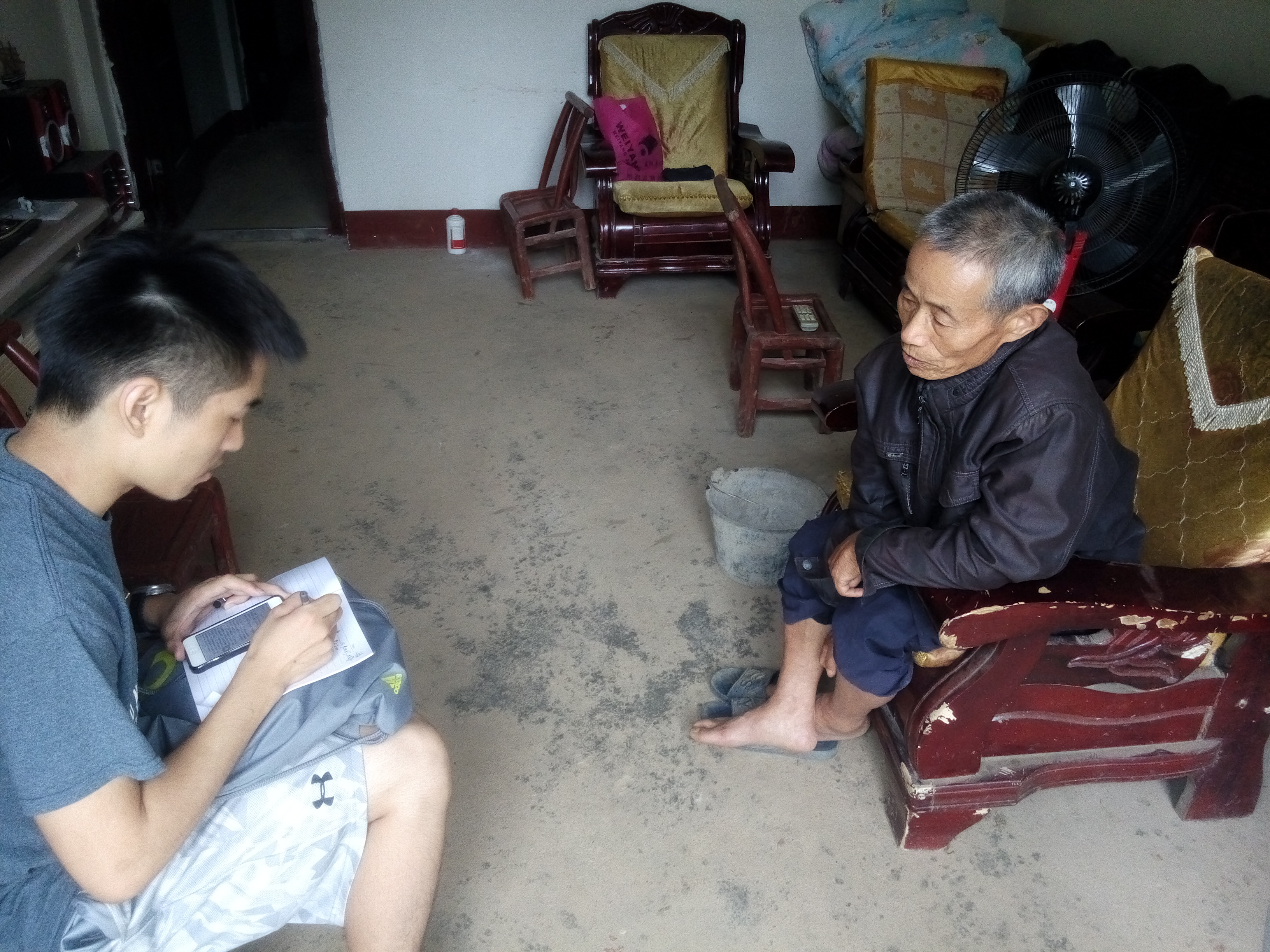 本次调研前后准备了一个星期,大家经过两次集体开会才确定调研的相关事宜。下午2点,团队成员分成五个小分队,从东城中学出发,到附近村民家中走访调研。团队成员每经过一家村民家时都会率先拿出工作证和湖大学生证表明身份和说明来意。这里的民风很淳朴,大多数村民对团队成员的到来表示欢迎,纷纷拿出凳子来招呼团队成员坐,也很乐意与队员们交流。本次调研进展十分顺利。