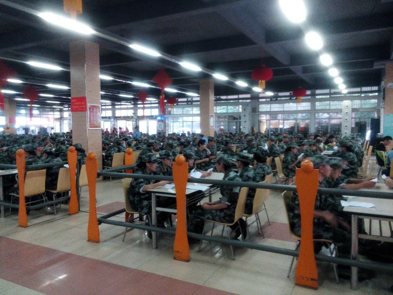 在食堂内身着军装的新生们整齐有序地端坐着,充满了作为军人该有的精气神。因下雨而在食堂内的新生们并没有闲下来,大家在教官的带领下学唱军歌。教官认真的一句句教,同学们也认真地学唱,也许有一点跑调,但是每个人都唱出了军人的气势,长出了军人的风范。碰巧到食堂的学姐学长再看到这有趣的场面后都不禁为大家的歌声和气势鼓起了掌。