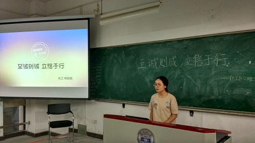 在大家还在因校园贷的危害巨大而感叹不已时,黄似琪乘热打铁,抛出了诚信问题。诚信问题相对于还没有切身经历的校园贷,尤其是考试诚信,是每个人都有切身体会的。然而诚信不止如此,从社会生活到学术研究再到考试评级,诚信无处不在。在学术研究的诚信方面,黄似琪讲到了近年来在学术论文方面频繁爆出的造假事件。她说:“现在国内外论文造假事件频发,而造假一旦被发现,那造假者的前路就会无望,他一生就毁于一旦。”所以她希望所有人在今后的学习工作中一定要恪守原则,讲究诚信,拒绝作假。而考试诚信这个老生常谈的问题也不容忽视,她相信化工二班每一个人都能认真地遵守考试相关规定,杜绝舞弊,诚信应考。