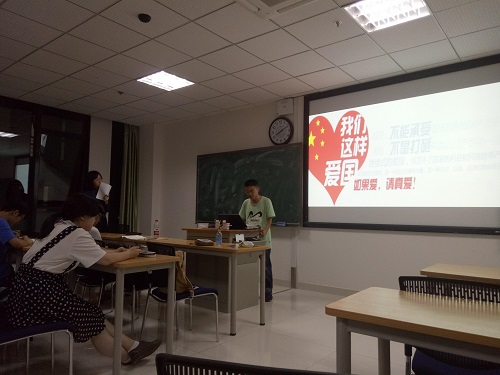 紧接着,大家对爱国精神进行了激烈地讨论,邢晨虎同学为大家带来的主题便是“理性爱国,我们应如何?”首先他讲到只有懂得何为国家,才能谈如何去爱。随后,他呼吁,爱国的最佳表示是努力提高国家实力,实实在在地超过外国,而不是停留在字面和口号上。在座的各位应该怀有爱国之心,但爱国不能盲目,如果以爱国为名而胡作非为,那么这种爱国已经蜕变成一种暴力行为,并且失去了它本应该蕴含的崇高意义。