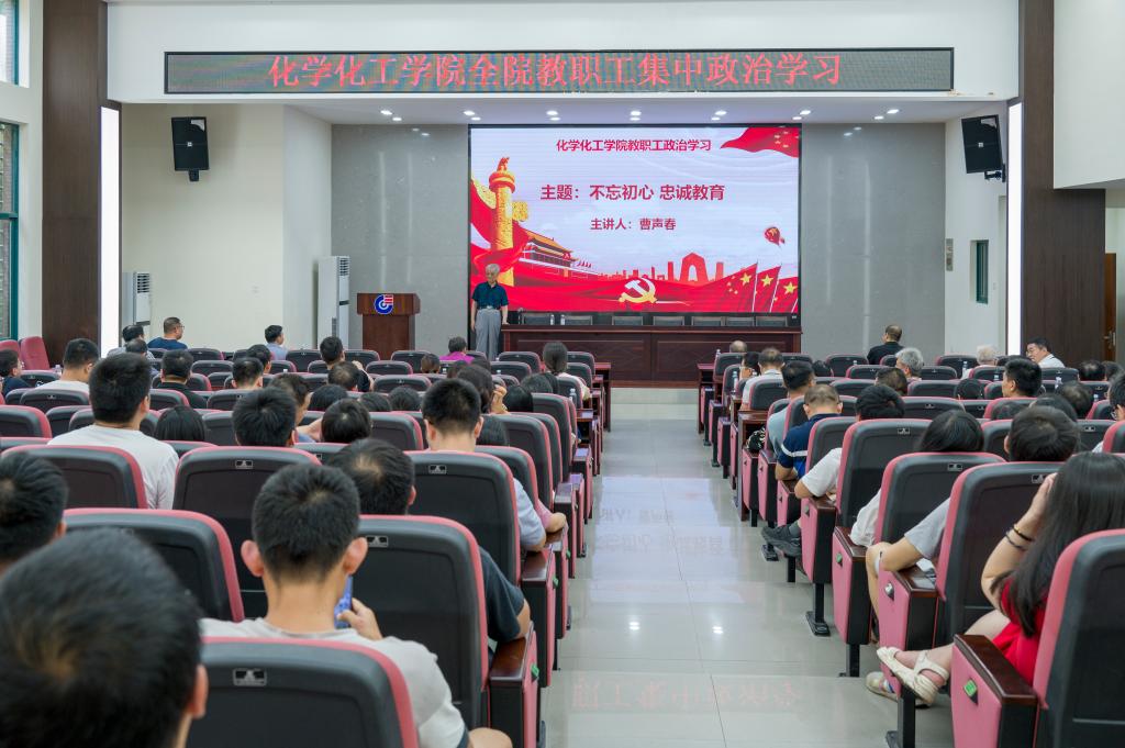于新化工楼D区报告厅开展了2021年第十八次全体教职工集中政治学习。本次集中学习主讲嘉宾为退休教授曹声春,授课主题为《不忘初心、忠诚教育》,学院全体教职工参与学习。