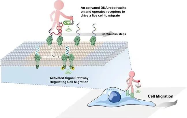 这是聂舟团队2021年取得的一项研究成果——他们开发了一种基于细胞膜表面行走的DNA分子机器人,通过不断激活受体信号通路实现细胞行为调控。
