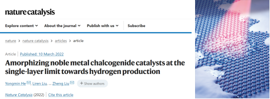 何勇民教授和新加坡南洋理工大学刘政教授、南京航空航天大学张助华教授团队合作,设计了单原子层贵金属催化剂,该研究成果以“”为题在线发表在《Nature Catalysis》,并入选三月杂志封面。