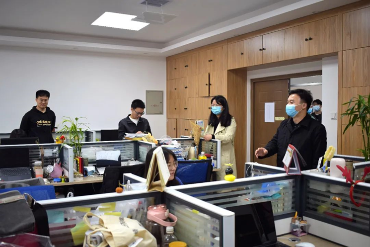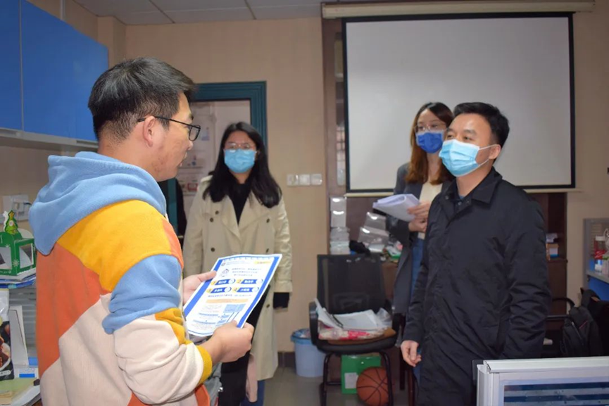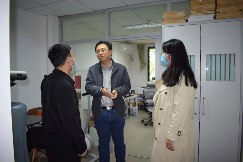 党委副书记潘刚峰老师、学工办主任兼研究生辅导员刘卓老师、研究生辅导员徐晓宇老师、研究生辅导员蒋晓洁老师及研究生会学生干部走访学院部分实验室。
