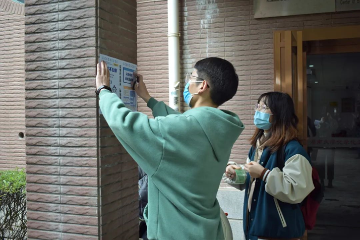 研究生会同学在实验楼栋张贴疫情宣传单