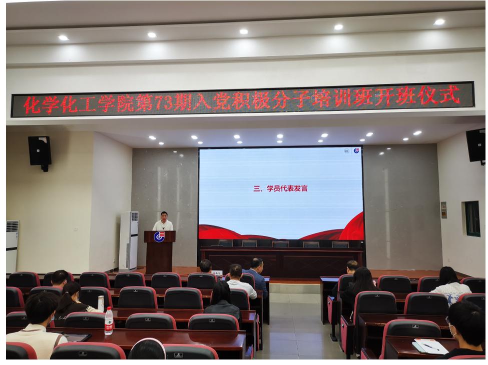 大会第二项,入党积极分子培训班的学员代表王蒙同学作为学生代表发言,为我们展现出了青年一代的活力与担当,展现出了青年一代为实现祖国的繁荣富强和中华民族的伟大复兴而不懈努力的决心!
