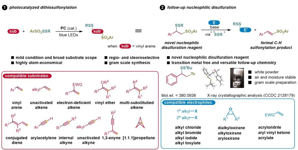 王兮教授课题组发展了一种可见光促进的烯烃(包括苯乙烯、芳杂环烯烃、未活化烯烃、富电子的烯基醚、贫电子烯烃、多取代烯烃)、共轭二烯烃、炔烃(包括内炔、端炔、芳基炔烃、未活化炔烃)、1,3-烯炔、螺桨烷与过硫代磺酸酯试剂(ArSO2-SSR)的连二硫磺酰化反应。此方法具有条件温和、底物普适性非常广、原子经济性高、立体选择性好等特点。反应可以放大量到克级规模合成。利用苯乙烯为底物的连二硫磺酰化所得到的产物,又可以作为普适的亲核连二硫化试剂,适用于一级、二级卤代烷烃(氯、溴、碘、对甲苯磺酸酯)的亲核连二硫化反应、环氧开环连二硫化反应、缺电子烯烃的迈克加成类型的连二硫化反应。该试剂为白色粉末,且对水氧稳定,不易吸潮、也可以放大量到克级规模制备。该亲核连二硫化反应也具有条件温和、底物普适性非常广、产率高等特点。