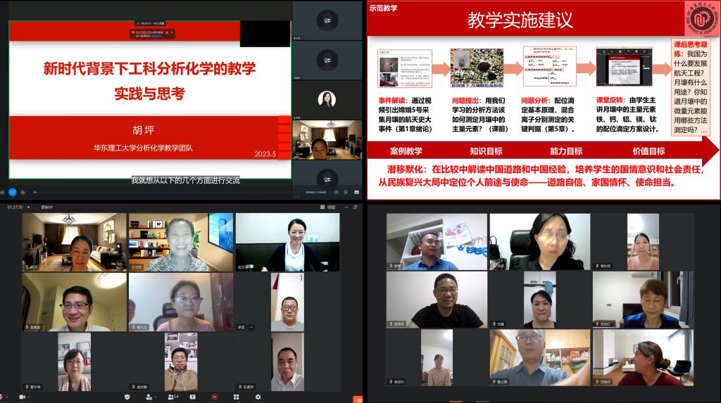 胡老师首先介绍了本校分析化学课程教学情况和课程发展历程,随后就工科分析化学的教学提出总体思想,以实例介绍如何在分析化学教学实践中开展启发式、案例式和活动式教学,来激发学生的兴趣、思维和活力。之后,胡老师以月壤中五种主量金属离子的含量测定为例,介绍了如何在绪论、课前、课中、课后开展课程思政教学设计与实施,以嫦娥五号采集月壤的航天事件为绪论部分的切入点,课前提出如何用学习的化学分析方法测定月壤主量元素的问题,结合配位滴定原理和混合金属离子分别测定的判据对问题进行分析,课堂中由学生主讲配位滴定方案设计,在潜移默化中培养学生的国情意识和社会责任,实现案例教学、知识、能力、价值目标的达成。最后,胡老师总结了新时代面向工科人才培养的课程建设经验。报告后,与会老师在线上与胡老师进行了热烈的讨论。