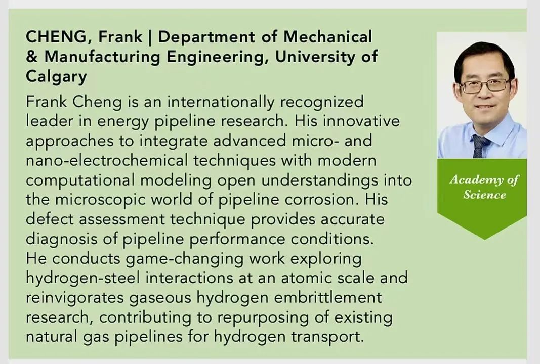金属腐蚀与防护专业(现应用化学系),1993年硕士毕业于中国科学院金属腐蚀与防护研究所(现金属所),1996年留学加拿大阿尔伯塔大学,1999年获材料工程博士学位。现任卡尔加里大学终身教授、先进材料与制造中心主任,为加拿大能源管道领域首席科学家、杰出材料科学家。目前主要从事氢气、二氧化碳和天然气管道的材料科学、电化学腐蚀与结构完整性研究。程玉峰以其在能源管道电化学腐蚀科学和材料科学领域做出的开创性研究成果以及巨大国际影响力当选加拿大皇家科学院院士。