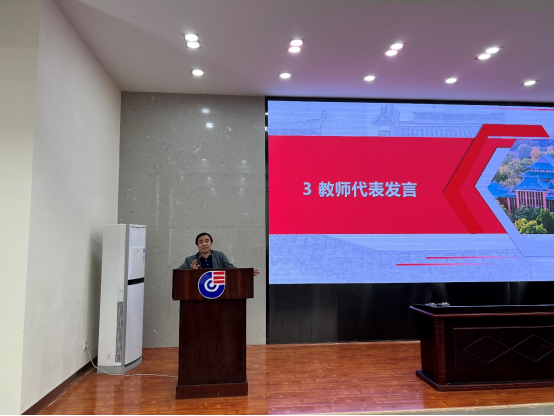 学生代表李稼睿从个人参加互联网+和挑战杯两个赛事的经历为切入点,从创新创业中所获得的书本上学不到的知识、如何进行创新创业、从创新创业获得什么等等进行了心得分享,为同学们参加创新创业加油鼓劲。
