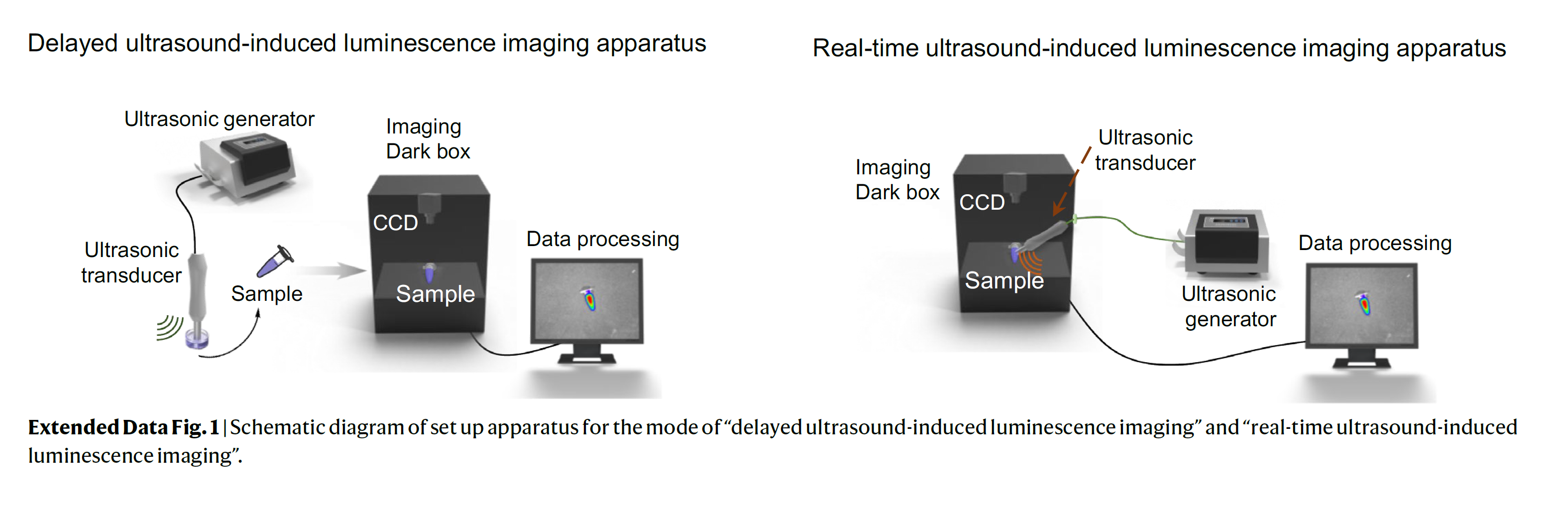 图1、延迟超声激发分子发光成像模式(左)和实时超声激发分子发光成像模式(右)实验装置示意图。