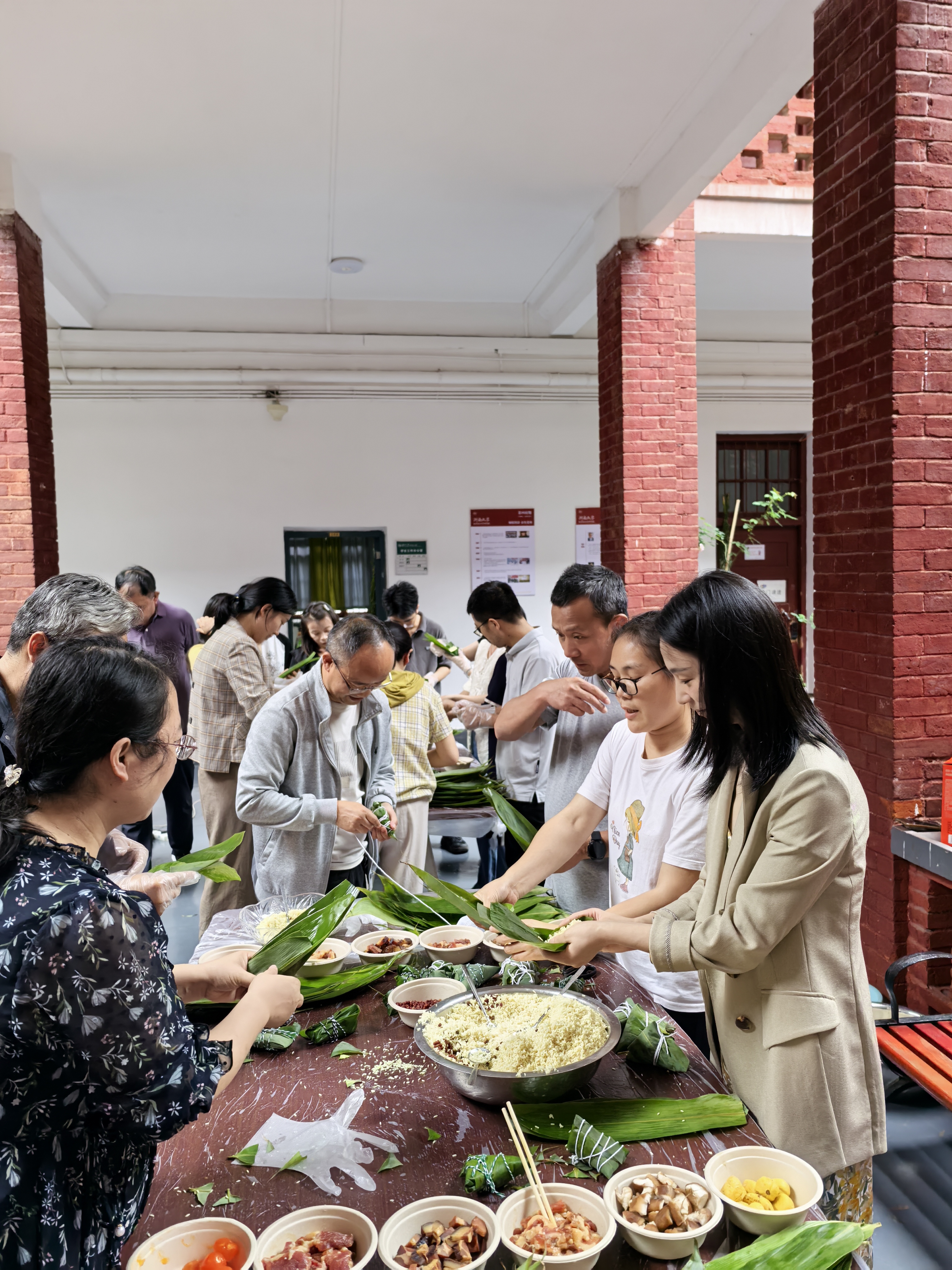 活动现场氛围热烈,专业人员示范并引导老师们亲自动手制作香囊,加深对香囊的了解,并了解其象征意义。接下来,老师们分组进行操作,制作五香蛋黄肉粽、蜜枣粽、水晶水果冷棕、大黄米藜麦燕麦棕、碱水粽等,老师在一旁指导并讲解端午节习俗和粽子的制作技巧。