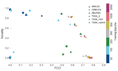 据估计,类药化学空间中可探索的分子数高达1023~1060个,在如此巨大的化学空间中进行分子结构的智能生成和快速优化是分子设计面临的巨大挑战。系统评估表明,t-SMILES可以构建多编码混合的分子表示系统以探索更广泛的化学空间,其中各种编码相互补充,从而提高系统的整体性能,其深度生成模型超越了目前测试的最先进的基于片段、图和SMILES的基线方法。并且,基于t-SMILES的模型可以规避资源有限数据集上的过拟合问题,在保证生成的分子与训练集合理相似性的情况下具有更高的新颖性,无论深度生成模型是原始的、数据增强的还是预训练后微调的。