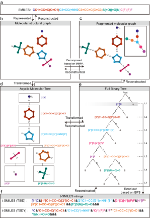 t-SMILES是SMILES的超集,它使用SMILES而不是字典ID表示分子片段,通过广度优先算法遍历分子树,从而形成与经典SMILES相似的线性字符串表示。