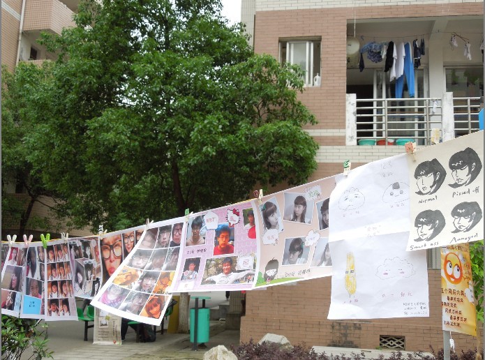 在明媚的阳光,一张张承载着趣味表情的照片在微风中摇曳摆动,它们或是搞怪可爱、或是卖萌傻气,无一不展现了青春的活力与精彩。同学们纷纷被吸引过来,站在照片前细致地欣赏,时不时一阵欢笑。在篮球场的这一角,悬挂着的照片就像一道亮丽的风景,用丰富的表情和色彩点燃了大学校园的活泼与精彩。